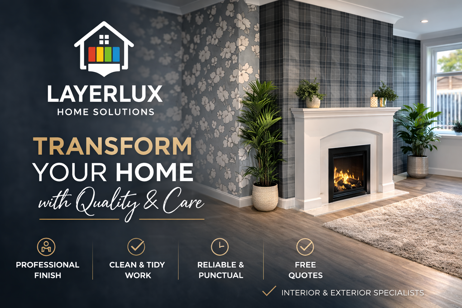 At Layerlux Home Solutions, we pride ourselves on delivering professional decorating services with years of experience in Glasgow and Surrounding areas. We are committed to providing top-quality finishes for both homes and businesses, ensuring that every detail is perfected. Our dedication to excellence means that we never leave a job until it meets our high standards, and our clients are always satisfied.